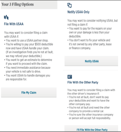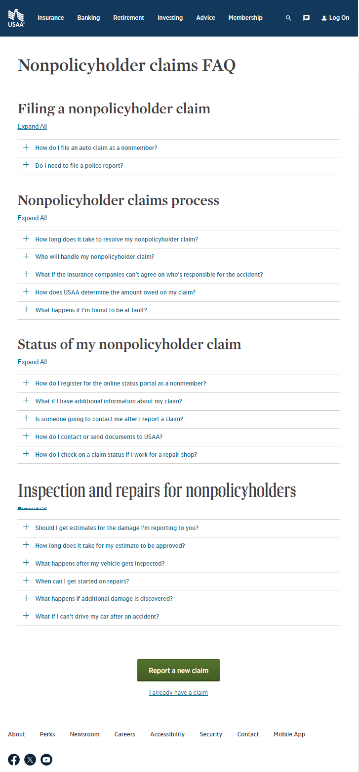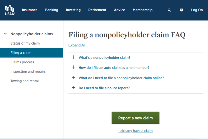 While the term “nonpolicyholder” is USAA specific jargon, there isn’t really a layman term for when a claimant files a claims against another driver. Our research revealed that many people are unaware they can file with the other driver’s insurance let alone what it’s called. Most people would search using more conversational terms or discover the idea that they can file with another company when going through their own company’s flow.